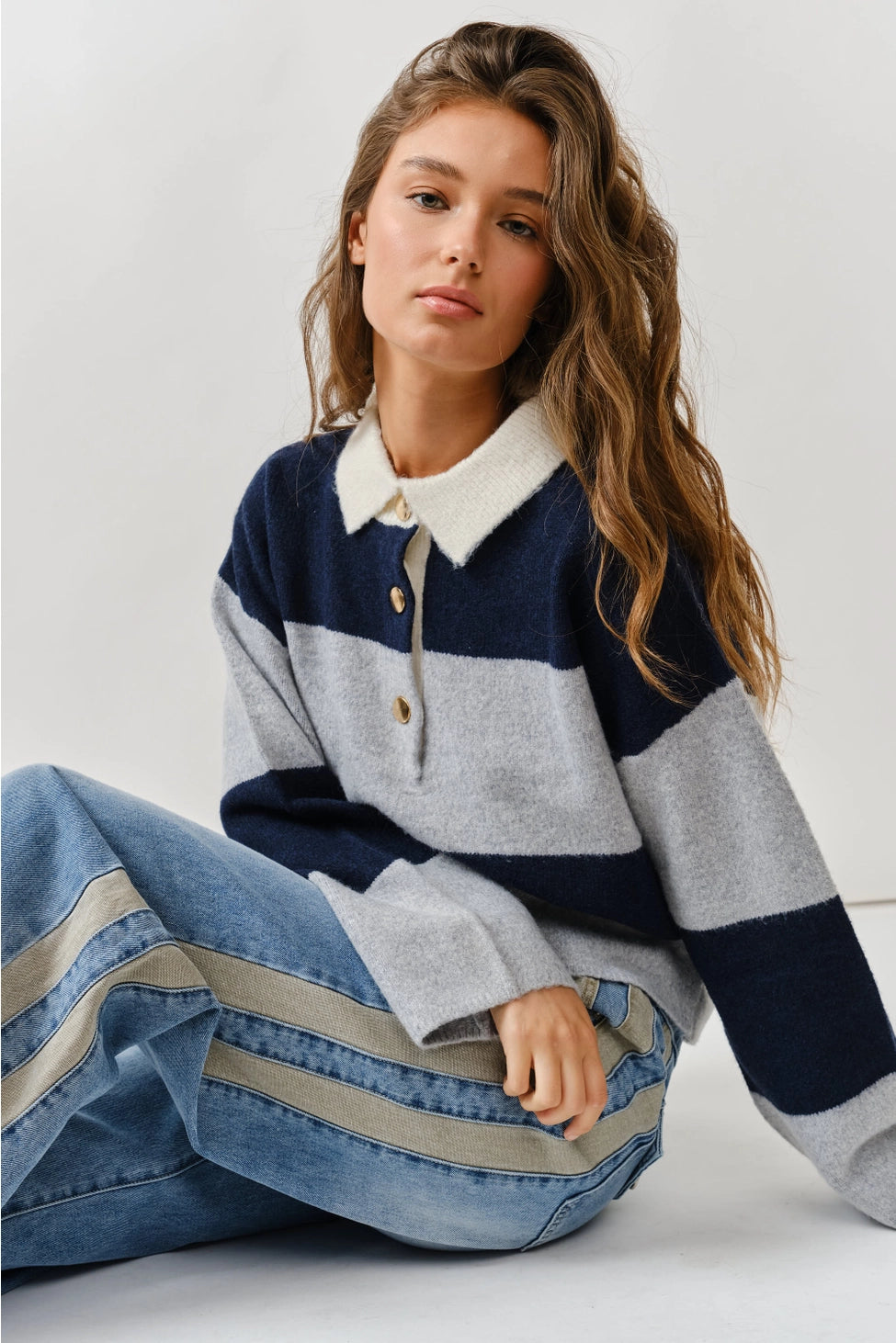 This Striped Polo Neck Sweater brings a playful preppy twist to your cool-weather wardrobe. Designed with bold horizontal stripes and a contrasting polo collar, it effortlessly combines classic and contemporary style. The relaxed fit and soft-touch knit ensure all-day comfort, while the button placket adds a refined finish. -Bold color-blocked stripes -Polo collar with snap button closure -Relaxed, slightly oversized silhouette -Soft and cozy knit fabric -Perfect for layering or wearing solo.