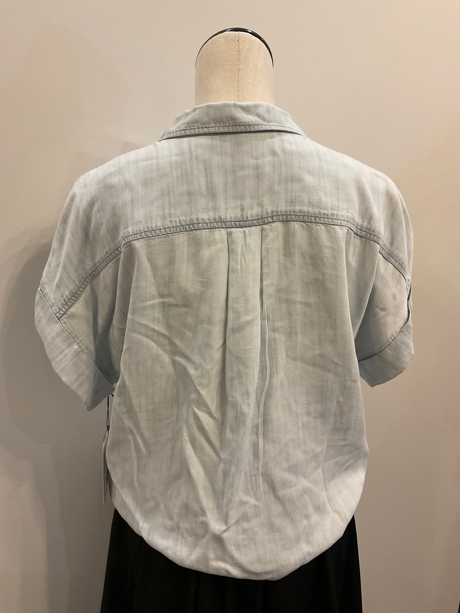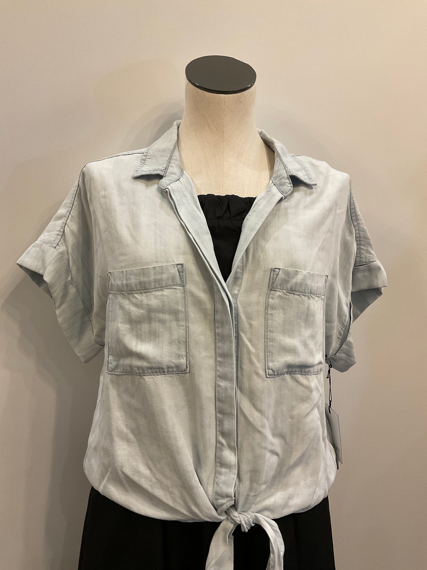 Effortless style meets sustainable comfort in this light denim button-down shirt. Crafted from 100% Tencel-lyocell, it's breathable and lightweight—perfect for layering or wearing solo. Features a classic collared design with a tie detail, cuffed sleeves for a polished look, and dual breast pockets for practicality. The fabric drapes beautifully while maintaining its shape, making it an ideal everyday piece that transitions seamlessly from casual to dressed-up occasions.