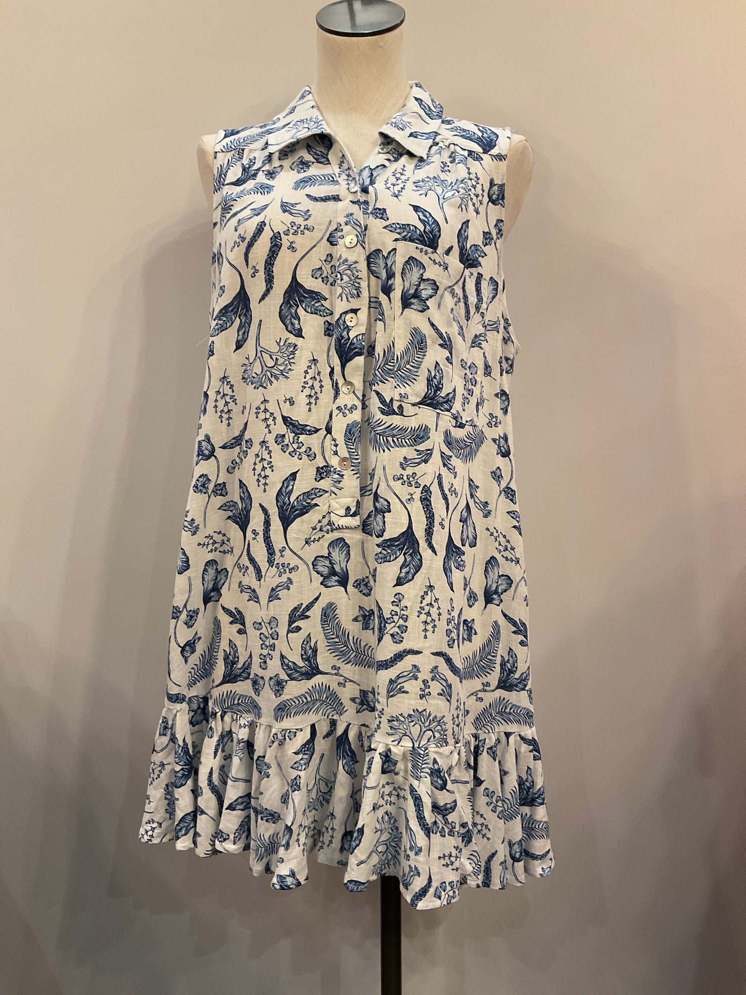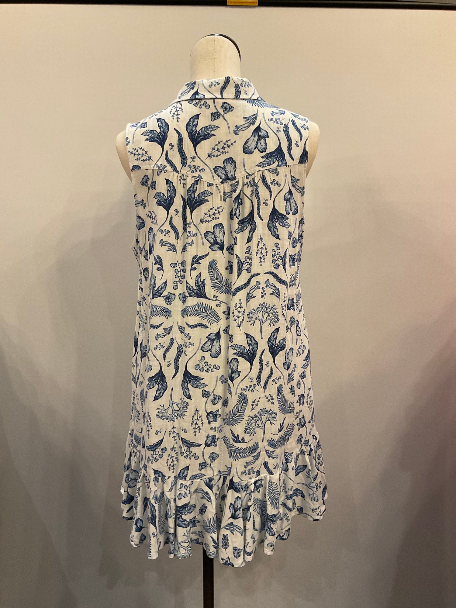 Slip into effortless elegance with this charming linen dress! Featuring a crisp white base adorned with a delicate blue pattern, this sleeveless V-neck mini is perfect for warm-weather adventures. The classic collared neckline and button front add timeless appeal, while practical pockets keep your essentials close. A playful ruffle trim at the hem adds just the right touch of whimsy. Lightweight linen keeps you cool and comfortable all day long.