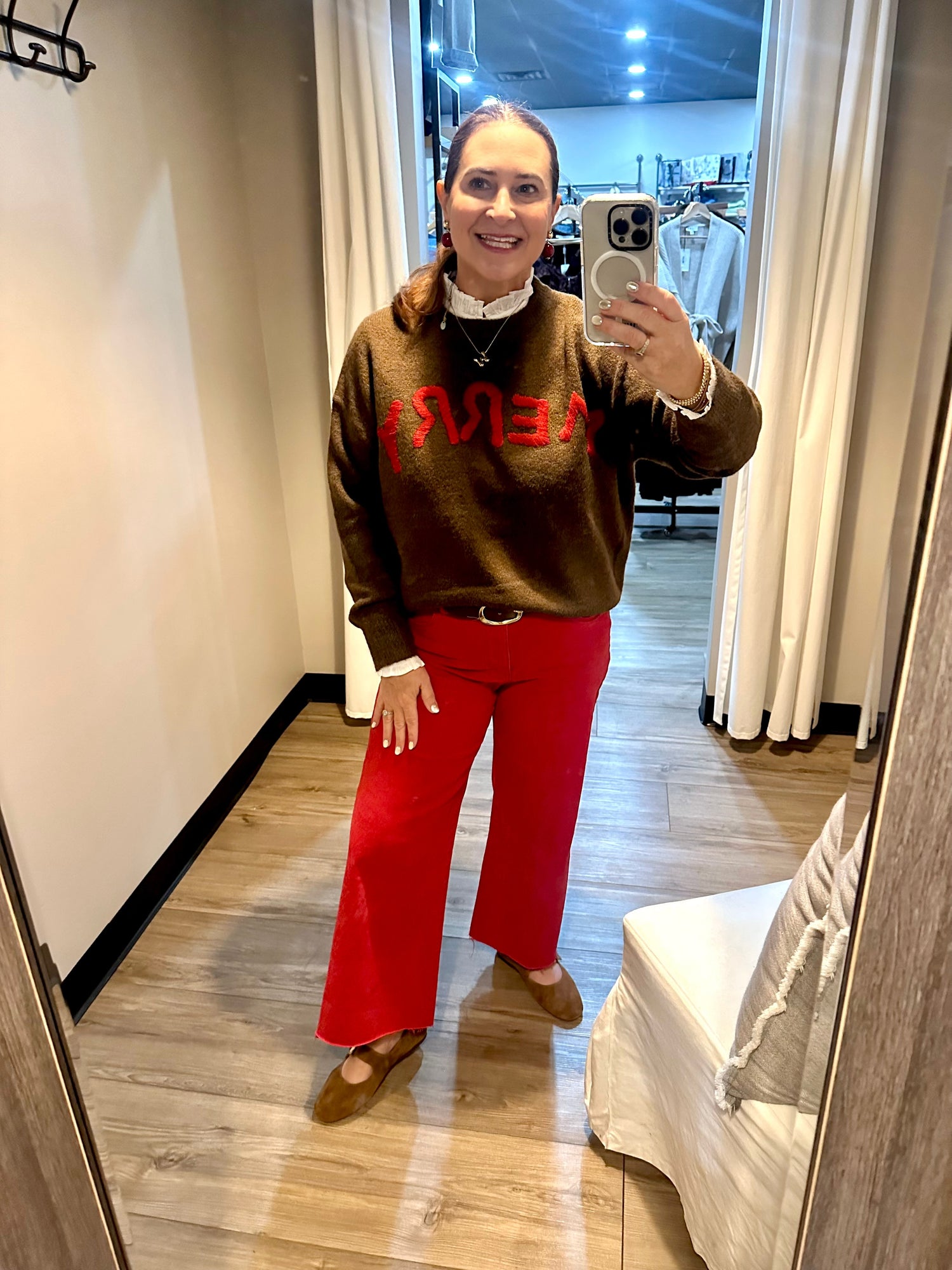 Wrap yourself in cozy charm with this brown merry sweater, complete with cheerful red stitching that adds a pop of festive flair. Perfect for holiday gatherings or casual winter days, this playful piece brings warmth and personality to your wardrobe. The contrasting red details catch the eye while the soft brown base keeps things timeless and versatile. A delightful sweater that celebrates the season with style and comfort.
