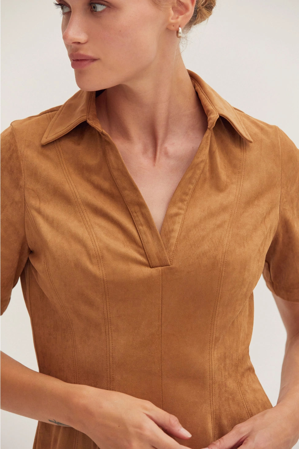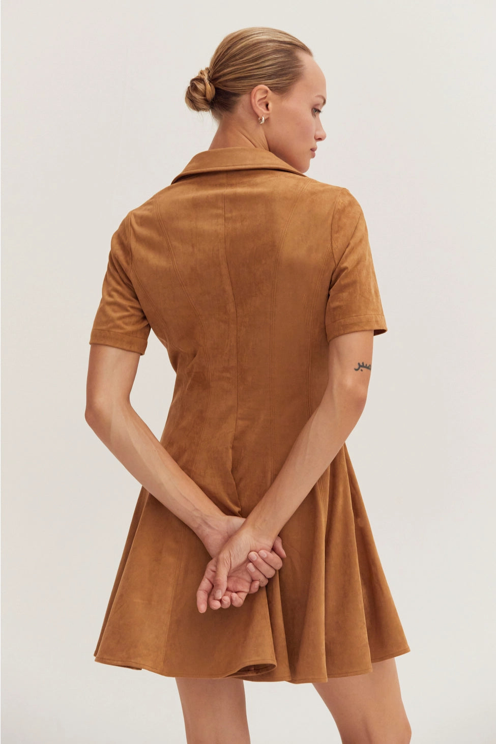 The Kenya Fit and Flare Polo Suede Mini Dress features a V-neckline with classic collar, short sleeves, pleated skater skirt design in a flattering fit-and-flare silhouette.