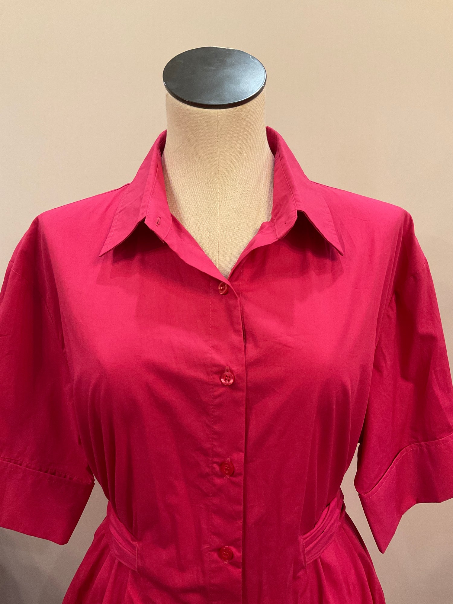 Make a statement in this vibrant fuchsia shirt dress that's equal parts fun and functional. The classic collared button-down silhouette gets a flirty update with a tied waist that cinches your curves just right, while cuffed sleeves add a polished touch. Practical pockets keep your essentials close, and the mini length is perfect for showing off your style. Whether you're dressing it up for brunch or keeping it casual for everyday wear, this dress delivers color, comfort, and personality in one fabulous package.