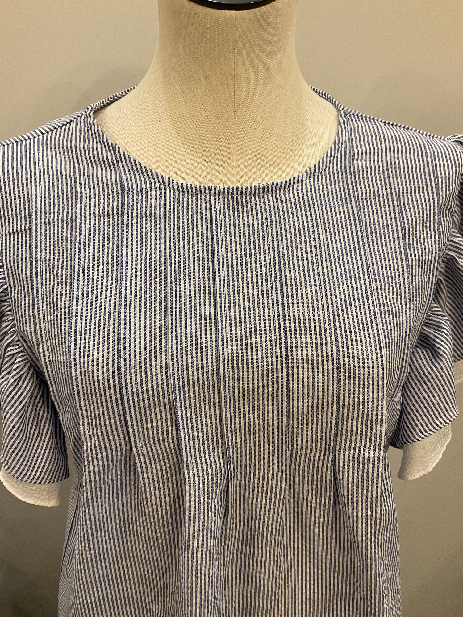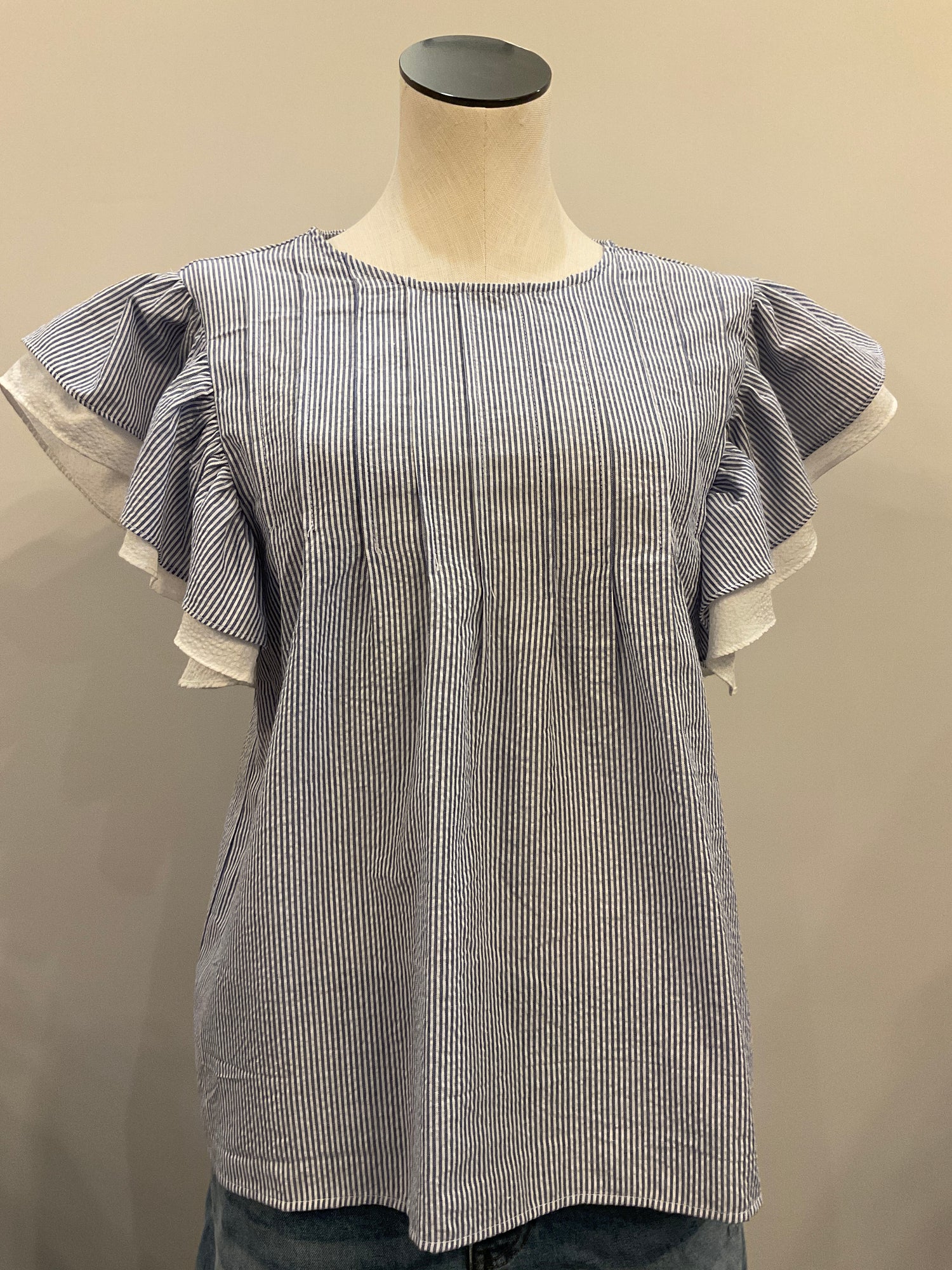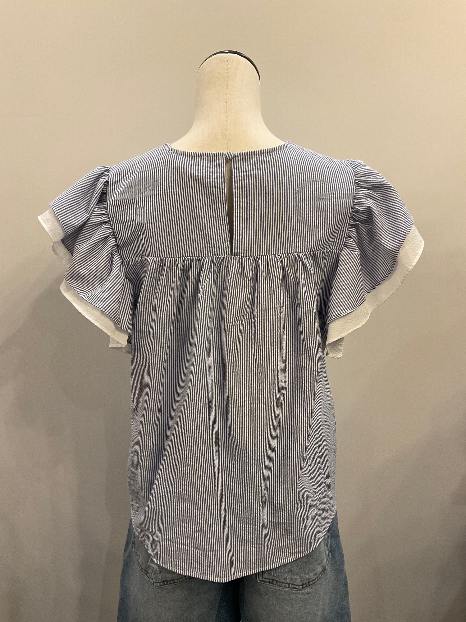 Effortlessly chic and undeniably fun, this flutter sleeve striped top brings movement and personality to your everyday wardrobe. Crafted from lightweight material, it features charming blue and white stripes paired with delicate ruffle sleeves that dance with every step. Elegant pleats flow gracefully from shoulder to chest, creating flattering dimension and visual interest. Perfect for layering or wearing solo, this versatile piece transitions seamlessly from casual outings to weekend adventures. A playful staple that feels as good as it looks.