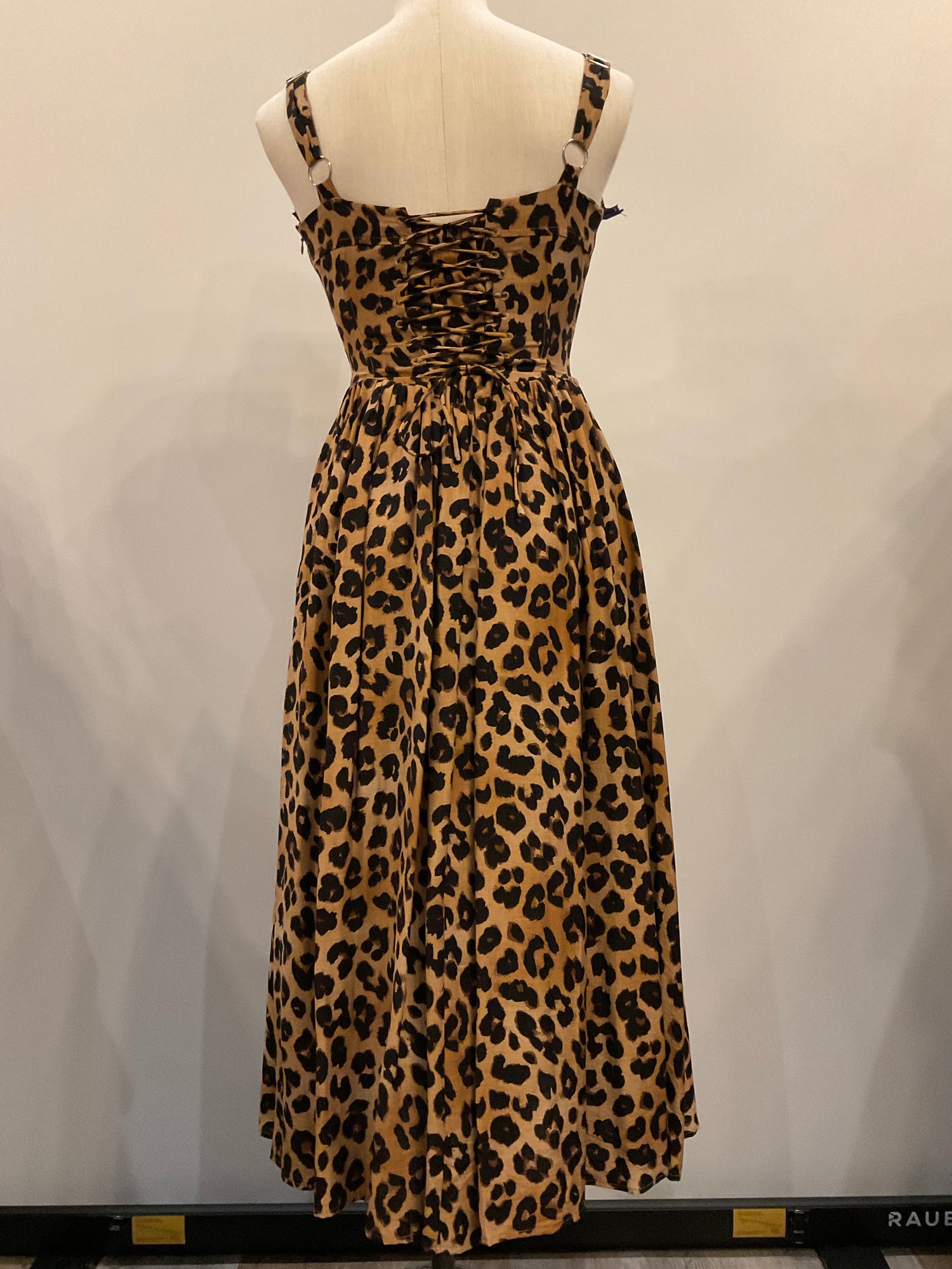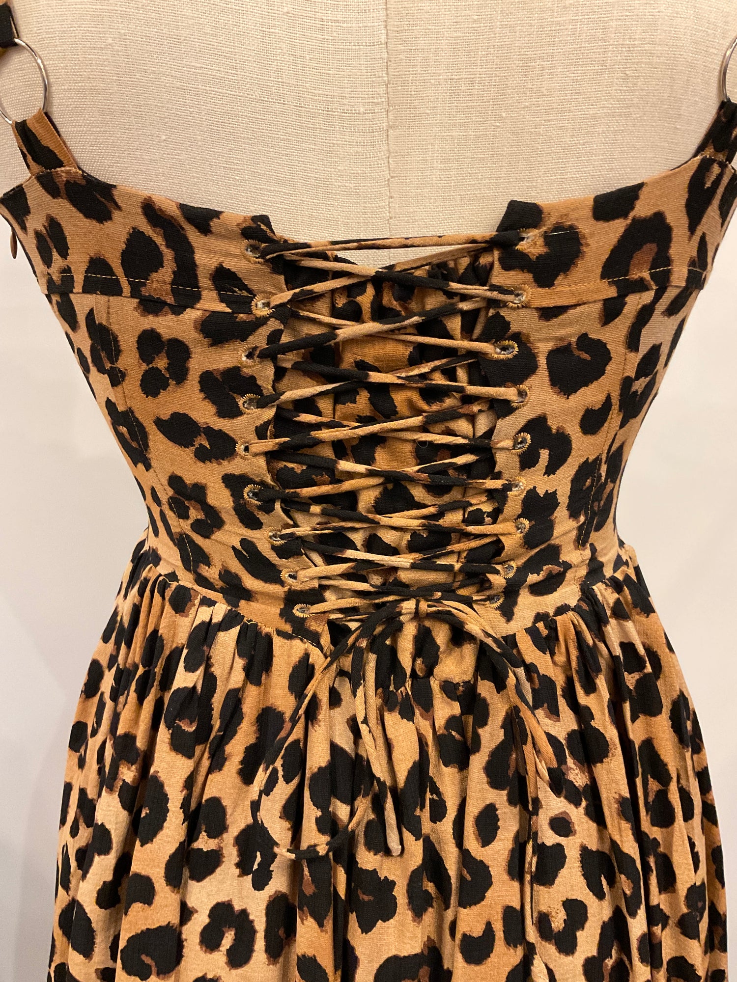 Turn heads effortlessly with this Leopard Print Lace Trim Corset Midi Dress. Designed to flatter your silhouette, it features a chic corset style that enhances your curves and delicate lace trim for a touch of elegance. The bold leopard print adds a fierce, fashionable edge, making it perfect for both day and night occasions. Embrace confidence and style in a dress that combines comfort with standout design.