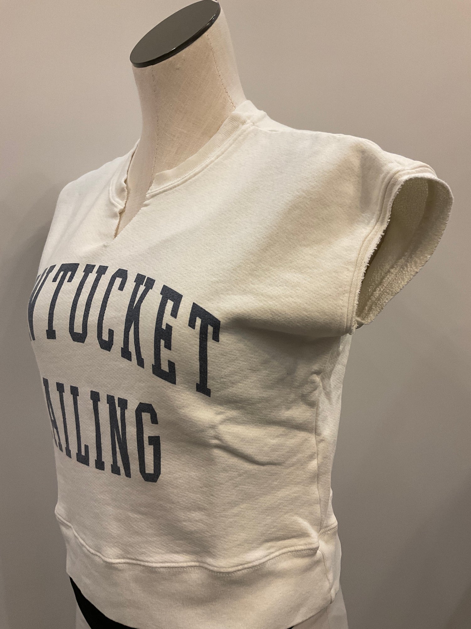 Catch the nautical vibes with this crisp white sleeveless crop sweatshirt, featuring a flattering V-cut crew neck. Emblazoned with navy "Nantucket Sailing" lettering, it's the perfect piece for channeling coastal cool whether you're heading to the harbor or just dreaming of seaside adventures. Lightweight and effortlessly chic, this cropped silhouette pairs beautifully with high-waisted bottoms for an on-trend look that celebrates your love of all things ocean.