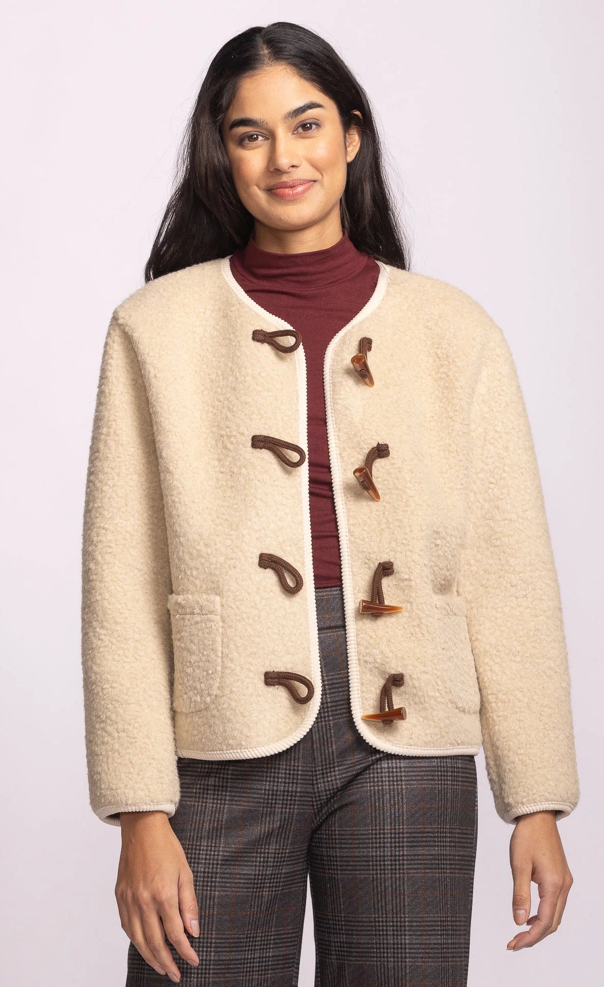 The Lomas Jacket is a fleece jacket designed with horn-toggle detailing for that rustic charm. This cool-weather staple adds instant polish to any outfit while keeping you cozy. Style it with a mock-neck top, jeans, and a pair of knee-high boots for a chic, sophisticated look!