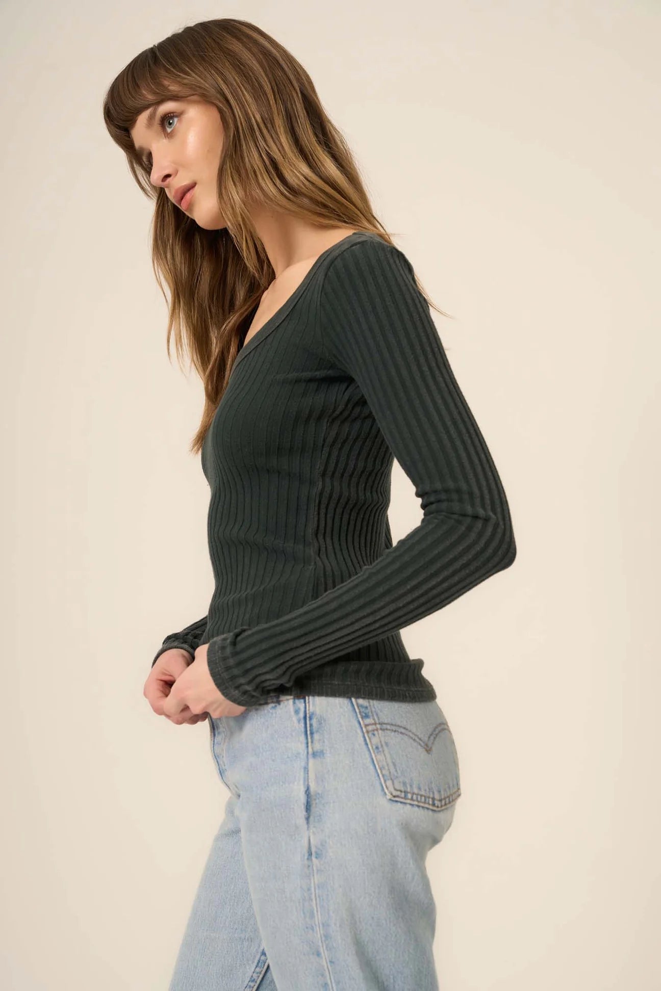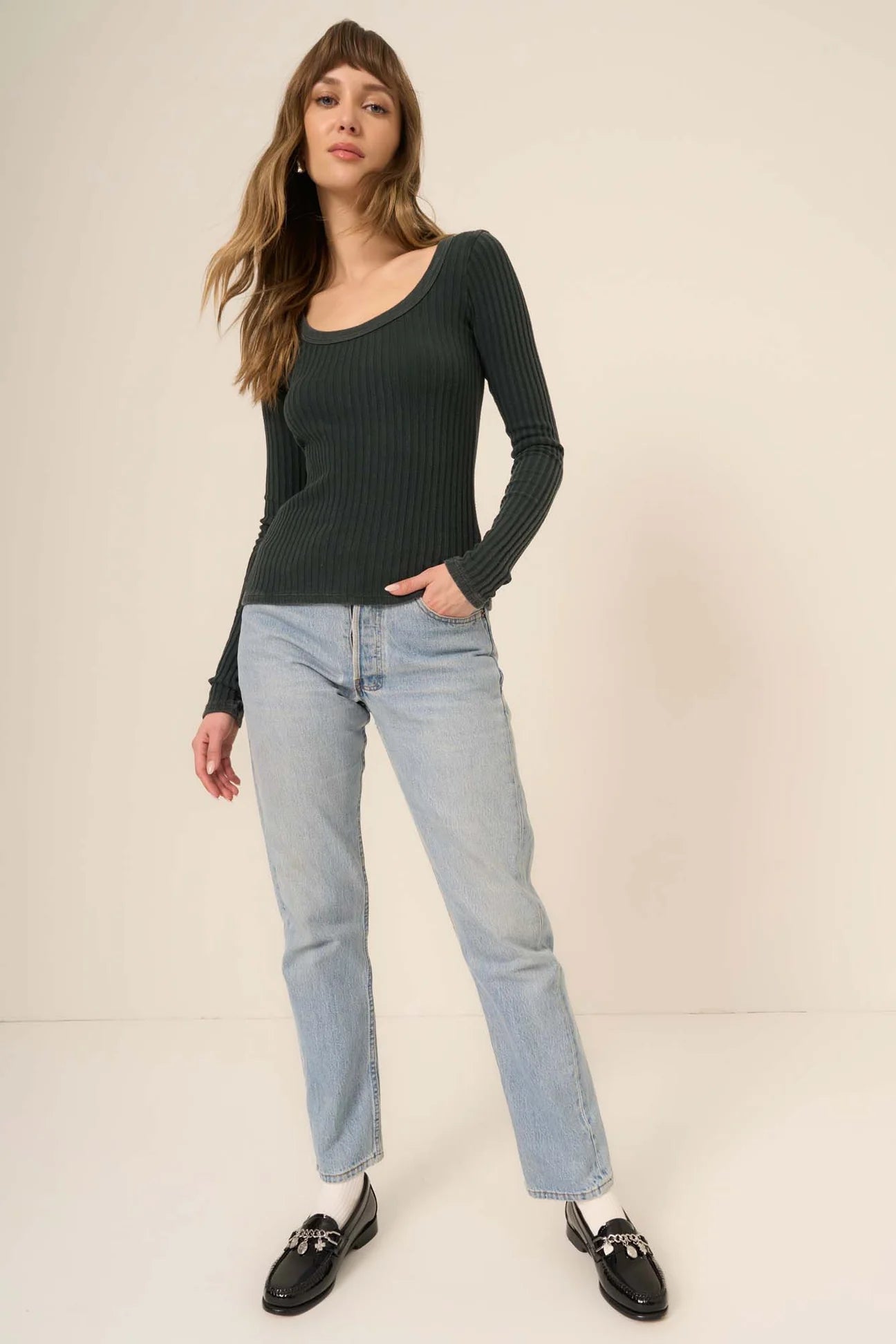 Our What's The Scoop Washed Rib Long Sleeve is the perfect blend of fashion and comfort, thanks to our iconic sweater rib fabric and washed-dye technique. The wide rib fabric, scoop neck, and fitted silhouette keep this long sleeve looking tailored while still feeling comfy.