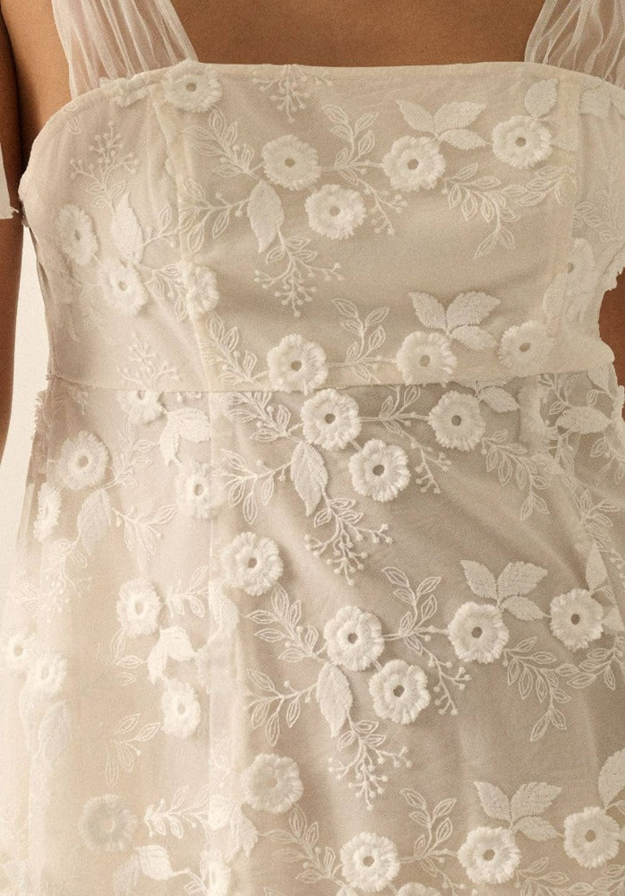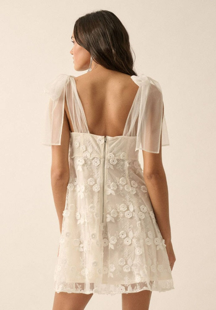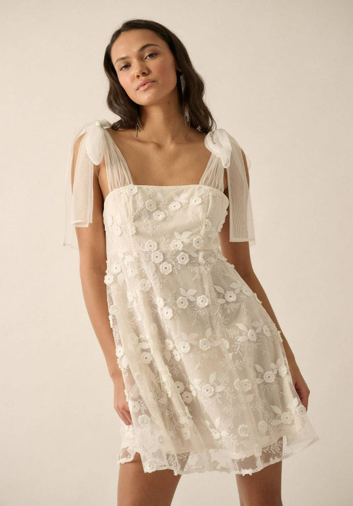 Indulge in elegance with our Cherished Moments Mini Dress. Featuring a sheer floral mesh overlay, soft inner lining, and sheer tulle tie straps, this mini dress exudes sophistication. The square neckline and back zipper closure add an elevated touch while maintaining a sweet and flowy fit. Perfect for bridal showers and weddings, this dress combines trendiness with comfort and style.