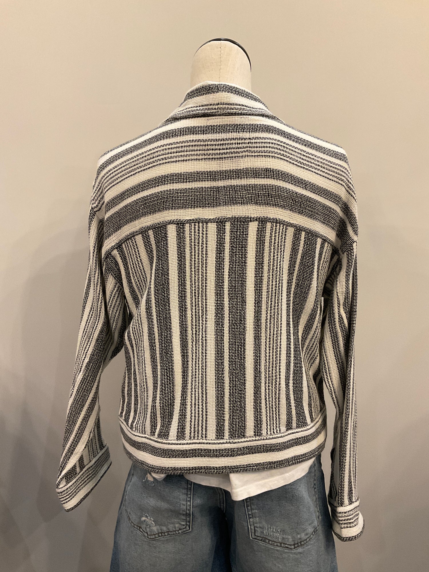 Stripes steal the show in this breezy knit jacket that's ready for anything. Featuring a classic black and white striped pattern, a crisp collar, and functional button-down front, it's got all the polish without the weight. Practical breast pockets keep essentials close, while the lightweight, airy fabric makes it perfect for layering through seasons. Effortlessly chic and endlessly versatile.