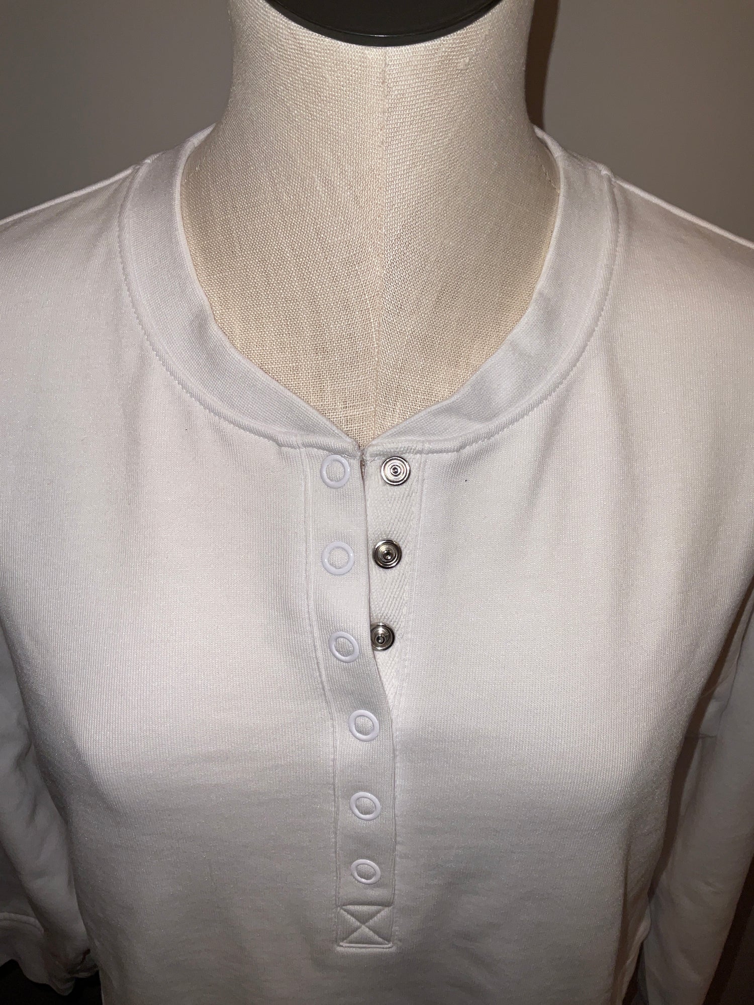 Meet your new favorite layering piece! This crisp white sweatshirt features a playful cropped cut and convenient snap front closure that lets you style it your way. The cozy crew neck and soft terry fabric make it perfect for those days when comfort is non-negotiable. Throw it on over a tee, pair it with your go-to bottoms, and you're ready to take on the world—or at least look fabulous doing it.