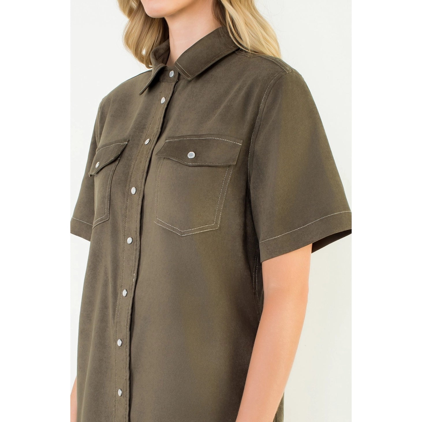 Short Sleeve Suede Dress . / Style Measurements for Size S / Designed in USA - Body Length: 34 3/4 in - Bust Width: 41 1/4 in - Sleeve Length: 9 3/4 in . / Model Sizes - Wearing Size S - Height 5' 9", Bust 32", Waist 25 1/2", Hips 36